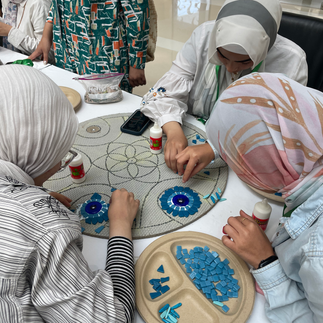 As part of the program, Sarah and I prepared for a mosaic mandala workshop at the Saudi German Hospital. At the reception lobby of the hospital, we welcomed all kinds of passers-by to join us in the creation of the mosaic mandalas: patients, visitors, children, doctors, nurses and janitors. Together we guided them step-by-step in the choice of color and design of the mosaic pieces, finally to complete 7 mandalas of different sizes.